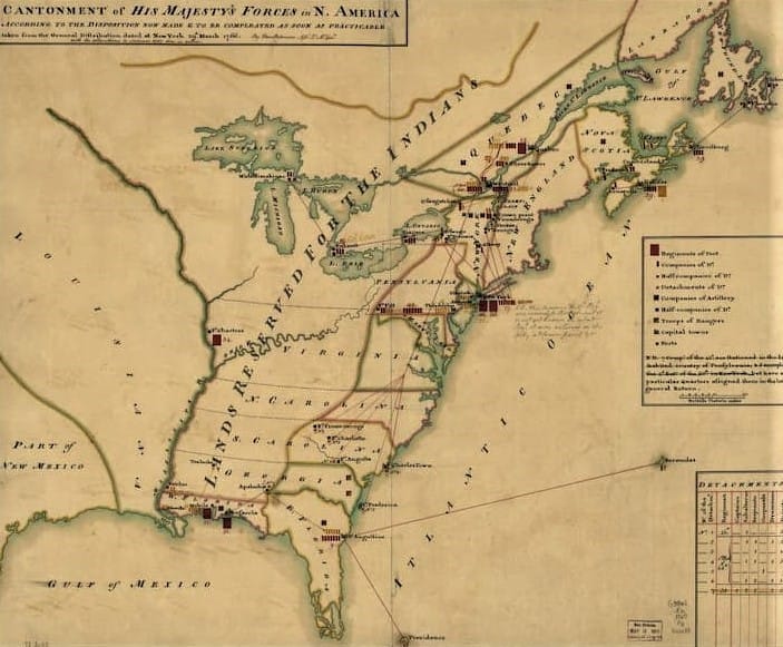 Having encouraged Quebec and Florida to generate conditions that would attract new settlers, the Proclamation had to address an impending economic crisis – fifty thousand soldiers and several hundred officers were returning to England and to their retirement at half pay. The Proclamation promised servicemen who remained in America “Quantities of Land” that ranged in size from fifty acres for “every Private Man” to five thousand acres for a “Field Officer.” The Crown hoped the offer would keep many British veterans from returning to England, as well as to ensure a sufficient supply of soldiers in case they should be needed on the North American frontier.