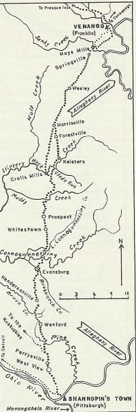 Washington confronts death twice while returning to Williamsburg from Fort Le Boeuf in 1753; first by French Indians and when crossing the fast moving, icy Allegheny River with Christopher Grist on a hand-made raft.