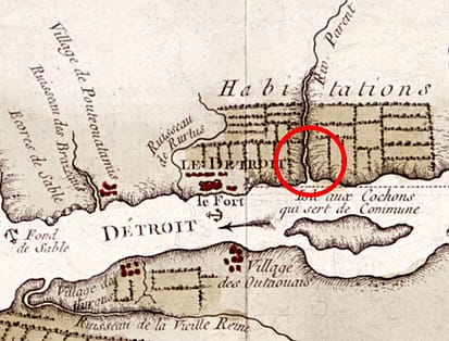 The Rangers’ whale boats moved slowly between the low banks of the Detroit River until the marsh and forest landscape opened to the isolated settlements that appeared on the river’s banks. On their right was the village of Wyandots, and to their left the lodges of the Pottawattamies. Then further on they saw the flag of France and knew it was flying for the last time (Ibid).