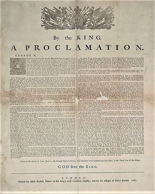 While the Indian war was getting very close to actually mobilizing its network of tribes against the English, an event occurred that had an important impact over its progress – the signing of the treaty of peace at Paris, on the tenth of February, 1763. With this treaty, France formally resigned her claims to the territories east of the Mississippi, and the great Mississippi became the western boundary of British colonial possessions. Britain portioned into separate governments their new acquisitions and left the Valley of the Ohio and its adjacent regions as Indian domain.