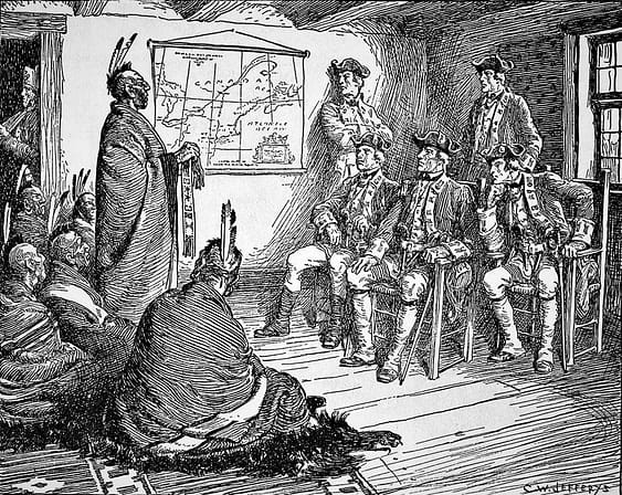 Tomorrow … Pontiac will come to the fort with sixty of his chiefs. Each will be armed with a gun, cut short, and hidden under his blanket. Pontiac will demand to hold a council and after he delivers his speech, he will offer a peace-belt of wampum holding it in a reversed position. This will be the signal for attack. The chiefs will spring up and fire upon the officers, and the Indians in the street will fall upon the garrison. Every Englishman will be killed, but not the scalp of a single Frenchman will be touched.